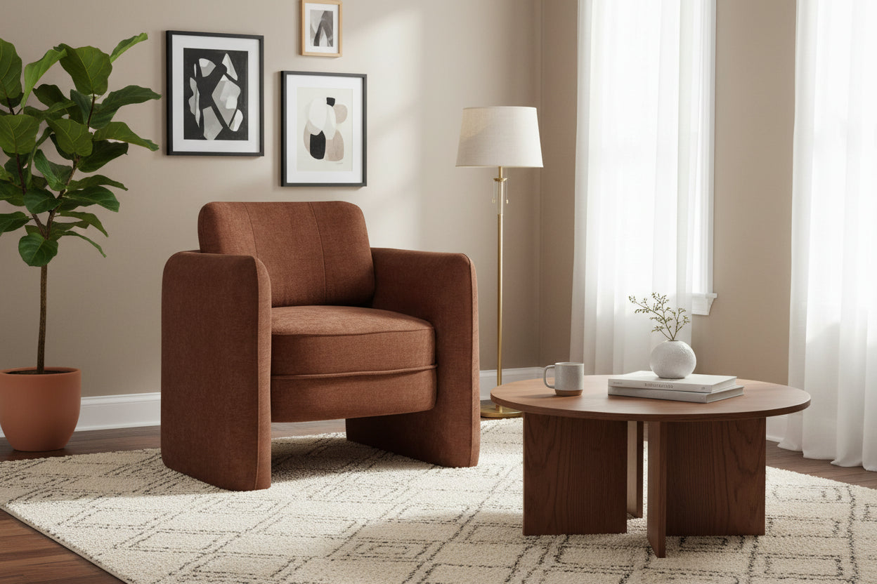 Elevate your living space with this beautifully designed accent chair, upholstered in warm, inviting terracotta fabric. Standing 32" high, this armchair effortlessly balances fashionable style with cozy comfort, making it a chic statement piece for any living room or bedroom. Its distinctive barrel shaped silhouette and gently curved back create a refined, contemporary look while providing comfortable support, perfect for long reading sessions or relaxed movie nights. Wrapped in soft touch fabric and filled with plush foam cushioning, this chair invites you to sit back, unwind, and enjoy moments of everyday comfort. Built with durability in mind, the solid engineered wood frame offers sturdy construction and long-lasting use.