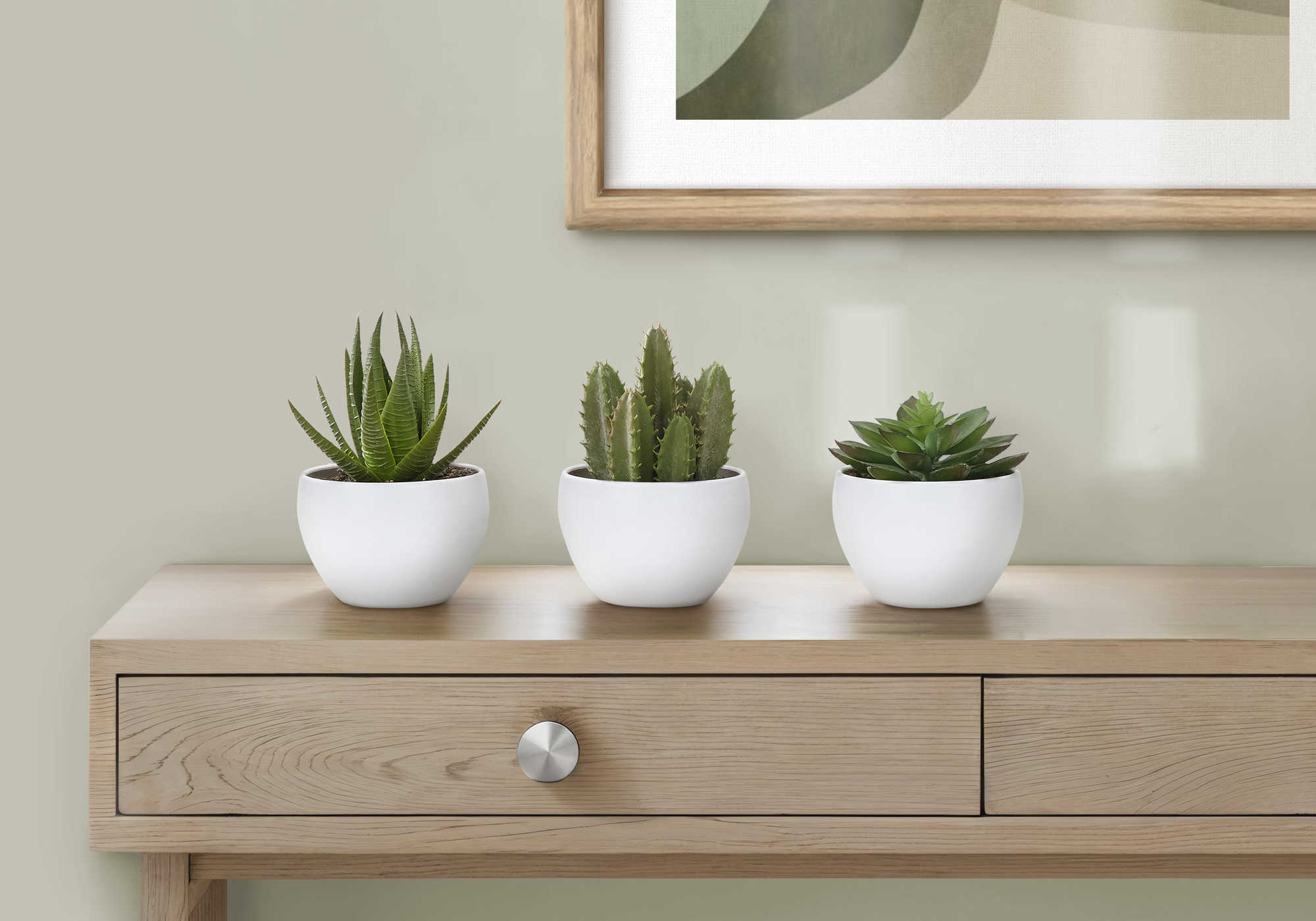 - Add a touch of greenery to your home or office with this set of 3 artificial succulent plants that stand up to 6" tall.