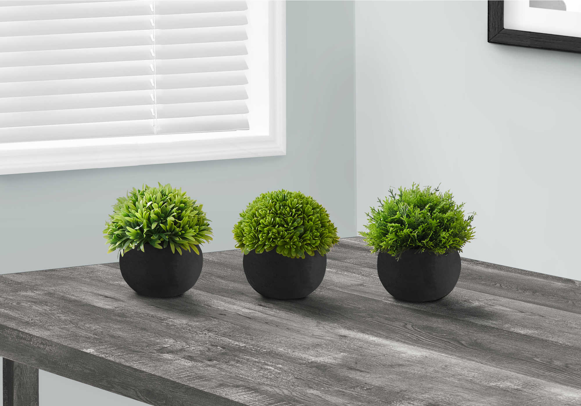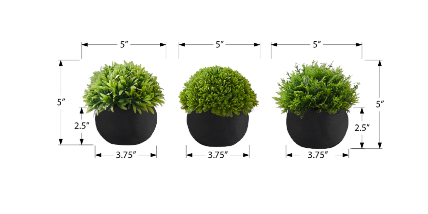 - Create your own oasis with this 5" tall set of 3 artificial plants in durable, paper pulp black pots.