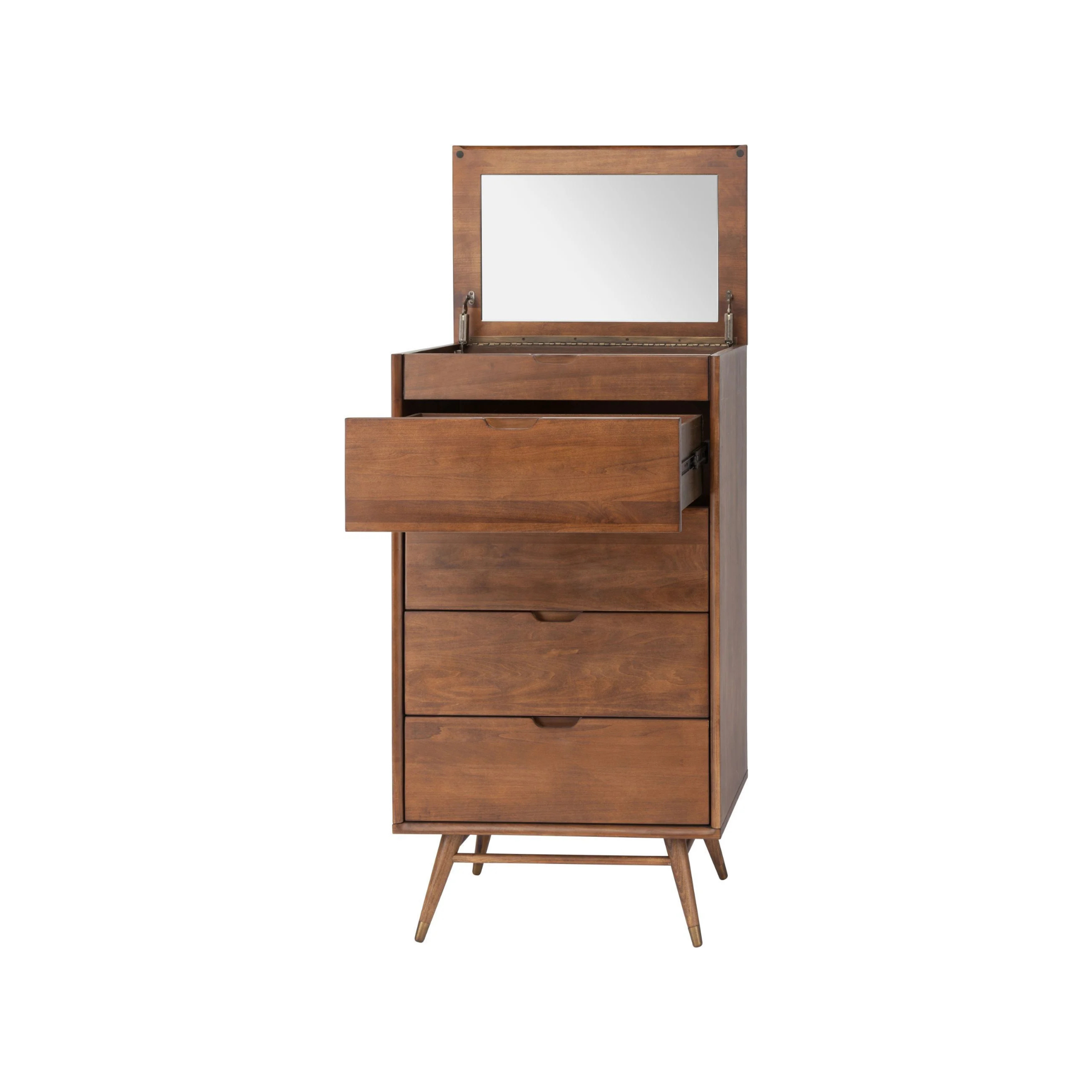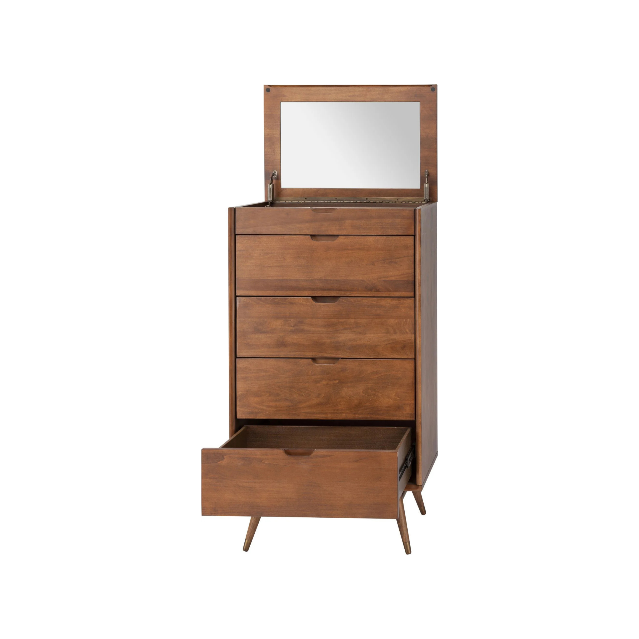 Mid century style, updated for contemporary living, the Case 4 drawer dresser features a flip-up vanity mirror, generous storage with soft-close hardware, resting on delicate tapered legs. Perfect for small spaces, the Case has a rounded, streamline look personifies refined, modern elegance. Overall Length 26.30" 66.80 cm Overall Width 17.80" 45.21 cm Overall Height 47.50" 120.65 cm Weight 110.00 lbs 49.90 kg