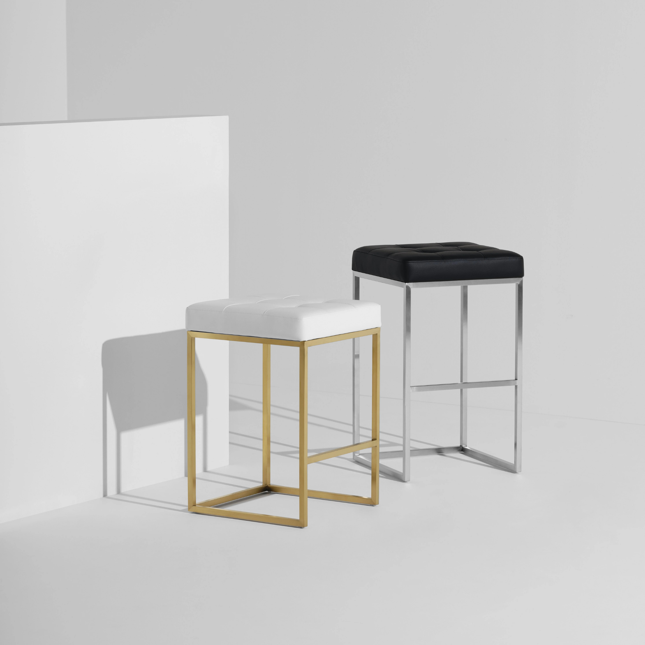 The Chi counter stool is an ideal example of simple elegant modern design. The brushed gold stainless steel frame, including fixed foot rest, uses a bare minimum of materials in its construction creating an exceptionally light effect. The stool is topped with a dense form fitting white naugahyde seat cushion for added comfort.