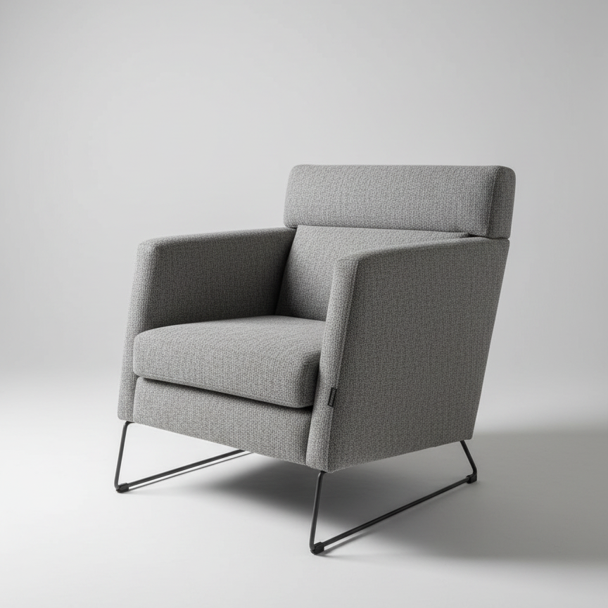 The Degano Armchair stands out with its elegant contrast of soft Kate Sky fabric and sleek metal grey legs. Designed for both comfort and sophistication, it offers a refined silhouette with plush seating that enhances any space. Perfect as an accent piece, it brings a fresh and modern touch to living rooms, offices, or chalet interiors.