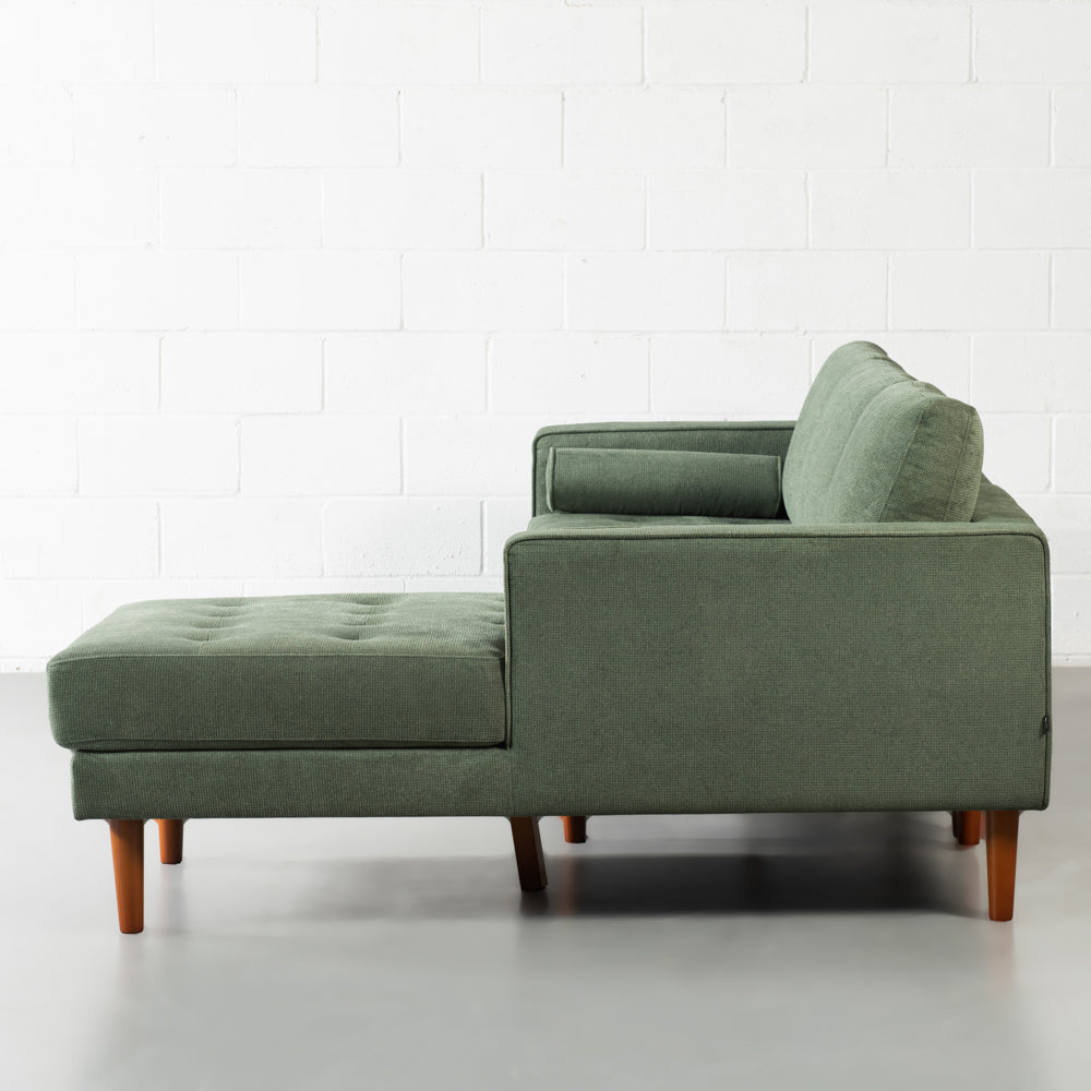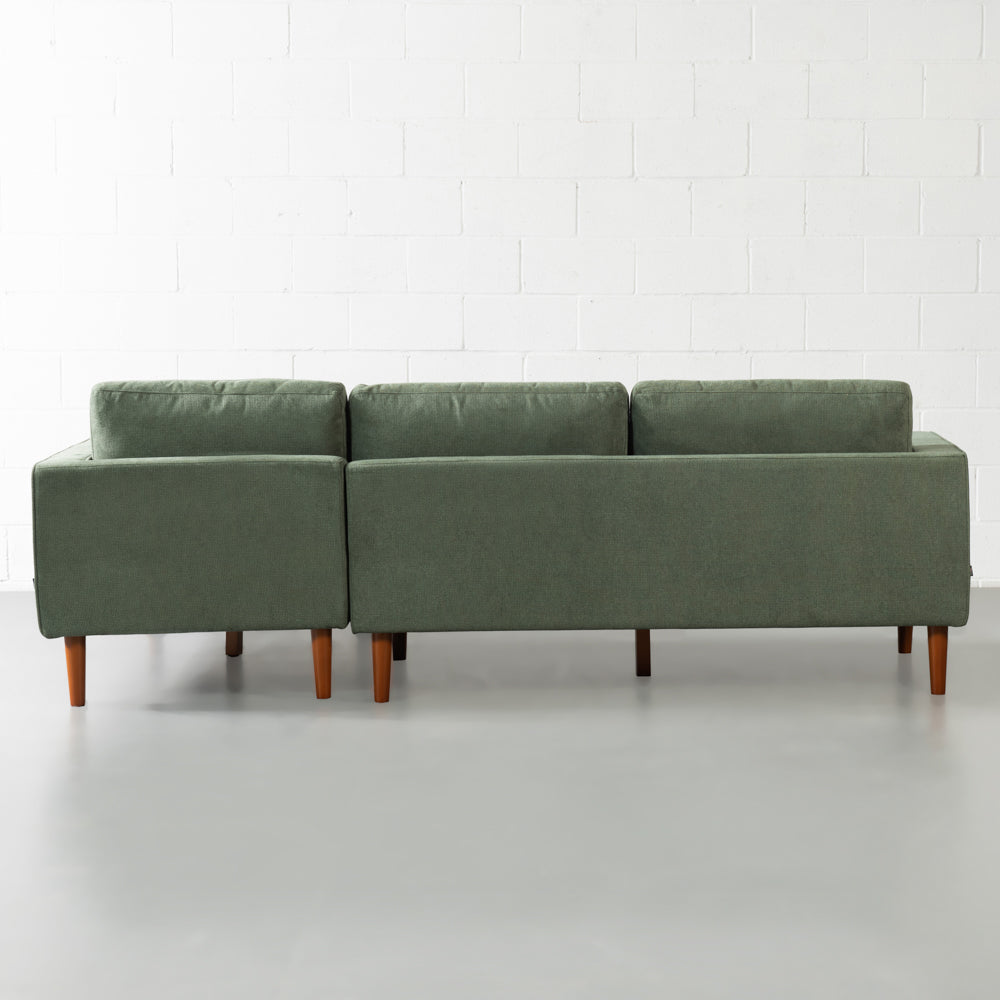 Timeless mid-century silhouette meets practical comfort in the FONDA sectional. Upholstered in soft green fabric and finished with warm walnut-toned birch legs, this left-facing design brings understated elegance to any modern living space.