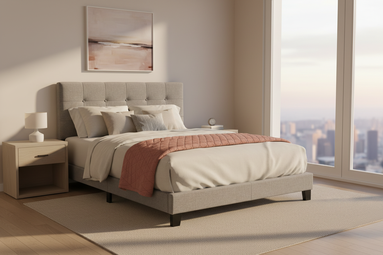 Low-profile bed frame upholstered in beautiful grey linen-look fabric with a tufted padded headboard