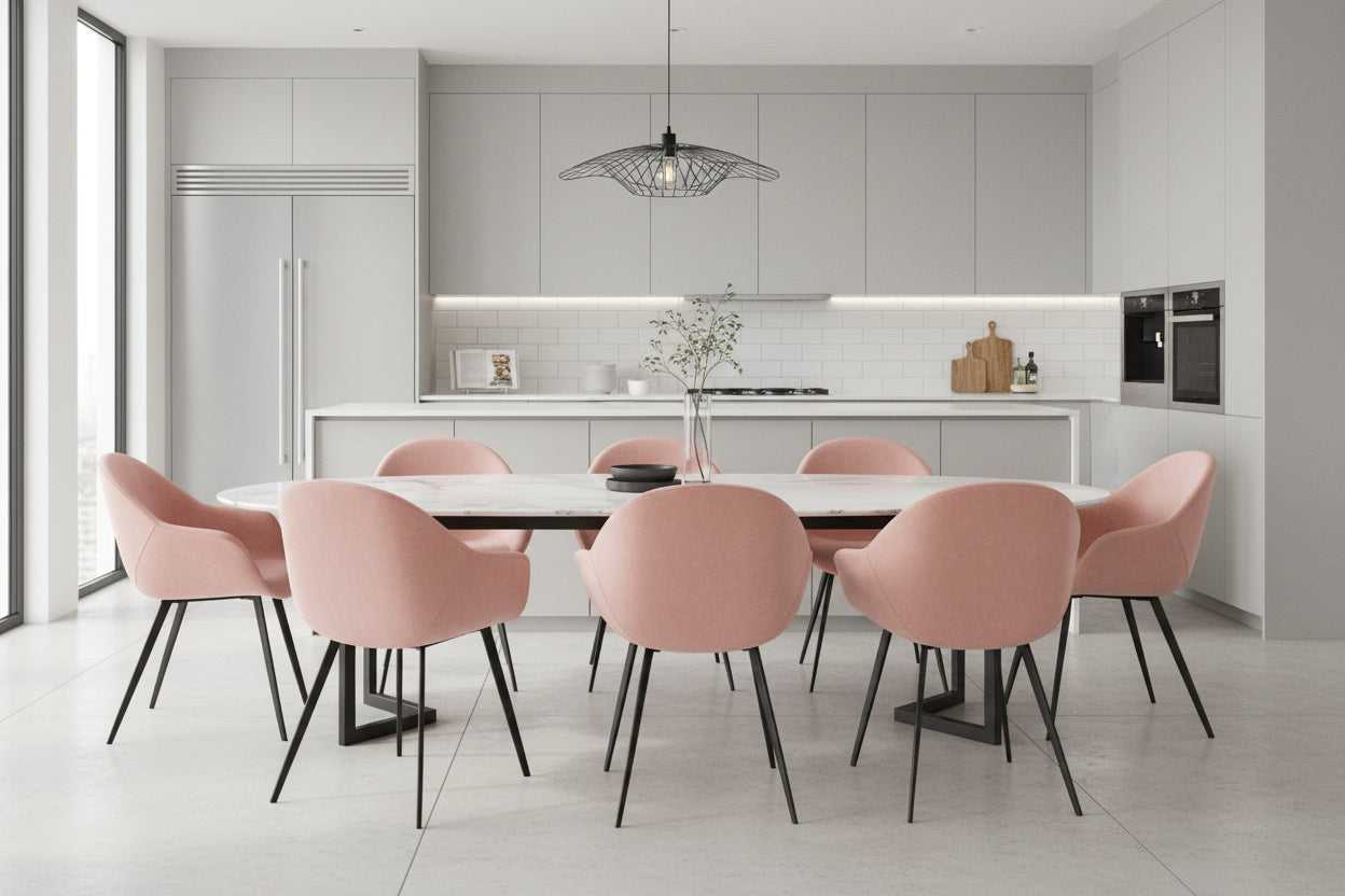 The Leila Dining Chair brings a refined and inviting touch to any dining space. Upholstered in a soft blush-toned fabric, this chair combines comfort and elegance with a clean, transitional design. Its sturdy metal base provides durability while complementing the chair’s modern aesthetic, making it a stylish addition to any dining room.