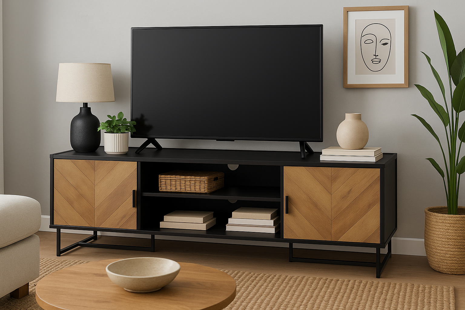 Sleek, modern, and effortlessly versatile — the Nora TV Stand brings contemporary charm and smart function to any living space. Designed with a sturdy black metal frame and warm wood-look doors featuring subtle V-groove detailing, this 72-inch console blends industrial edge with a touch of natural elegance.