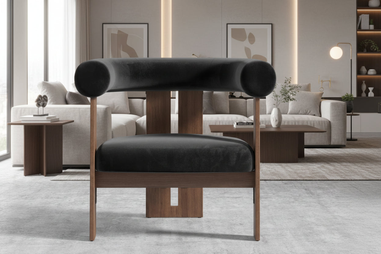 The Tola Lounge Chair infuses any home with a sophisticated elegance, radiating a delightful harmony. With its plush, curved silhouette complemented by rich wood tones, the Tola effortlessly stands out in any living room.