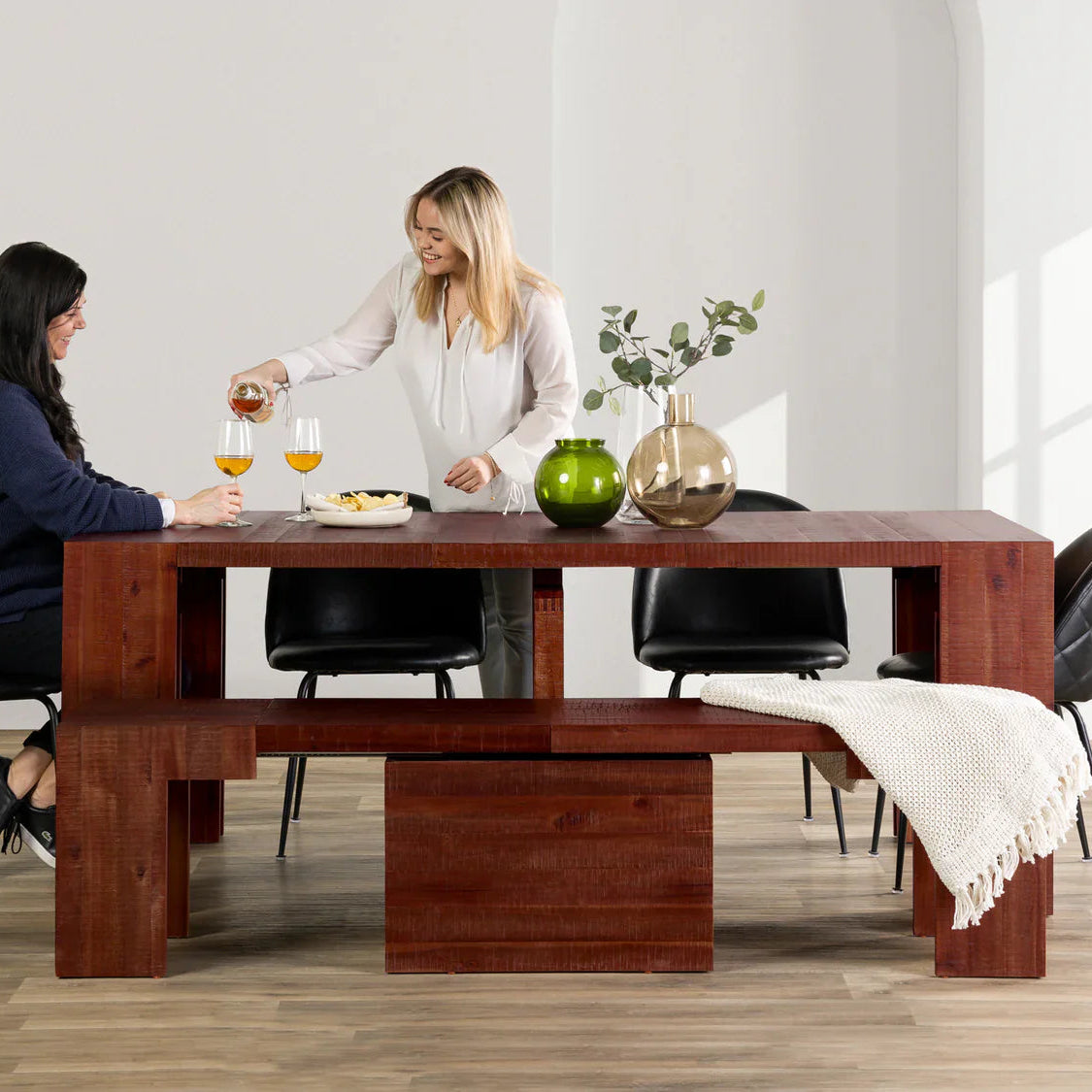 This unique 6-in-1 extendable bench can seat up to 6 guests and features panels that store away seamlessly, making it an efficient, space-saving solution for any gathering.