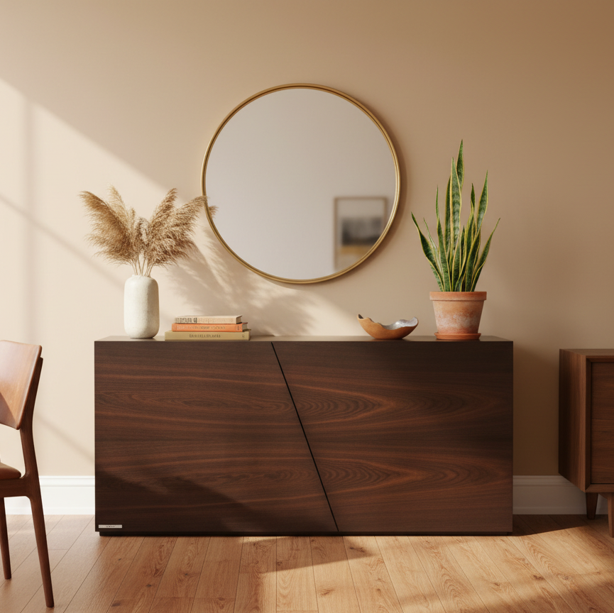 The CATTELAN Explorer 2-Doors Console — A masterpiece of modern Italian craftsmanship and refined contrast. Featuring a matte graphite top paired with burnt oak doors, the Explorer console balances warm natural texture with sleek contemporary finishes. Its clean geometric silhouette and premium materials make it a striking yet versatile statement piece for entryways or living spaces. Elegant, functional, and timeless, the Explorer Console embodies CATTELAN’s signature fusion of artistry, sophistication, and modern design.