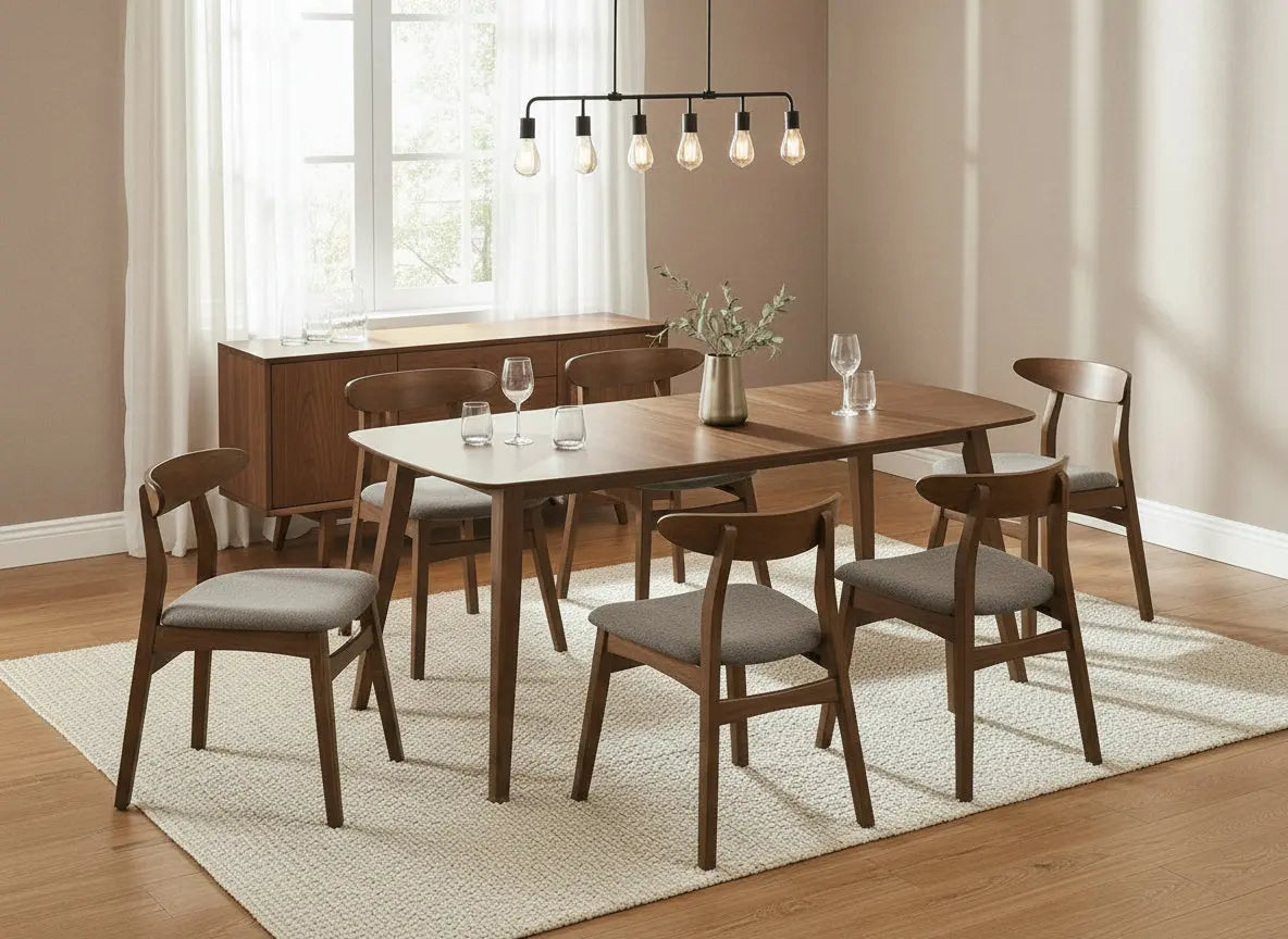 Bring a touch of mid-century flair to your dining room or kitchen with this fashionable 72" rectangular dining table. Crafted with a dark walnut veneer top and solid wood angled legs, this durably designed piece is perfect for casual family dining, easily seating up to 6. The easy to clean top ensures that mealtime messes are a breeze to wipe away, while the easy to assemble illustrated instructions makes setting up this stylish dining table a cinch. Backed by a 2 year limited warranty, you can trust in the quality of this sleek addition to your home. Pair this table with some matching chairs (sold separately) and upgrade your space with this fashionable style dining table today!