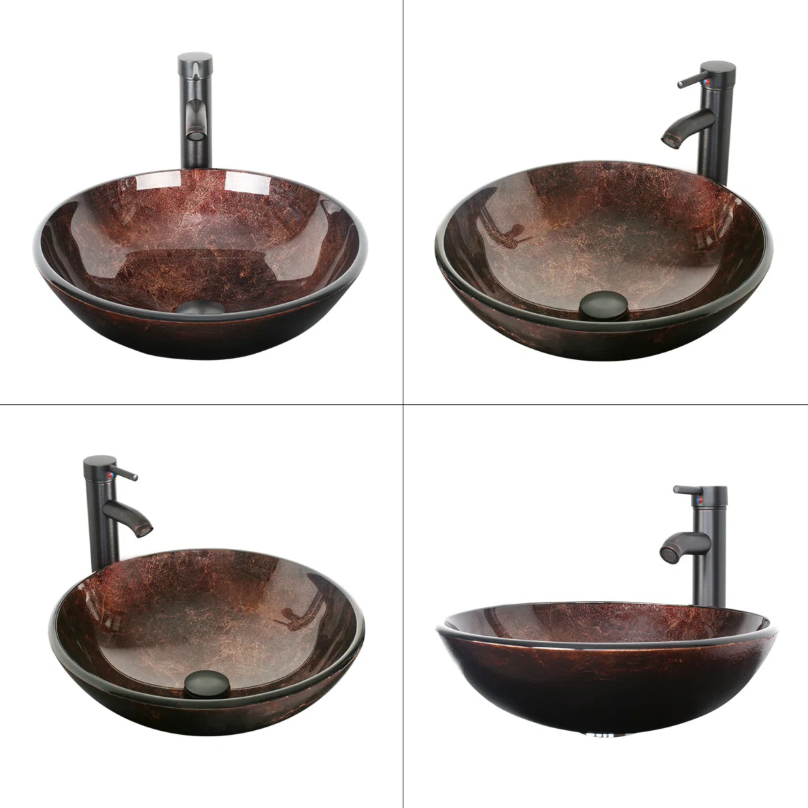 Eccleston - Lavabo de salle de bain circulaire en verre trempé brun de 42 cm (16,5 po) avec robinet BT-A09
