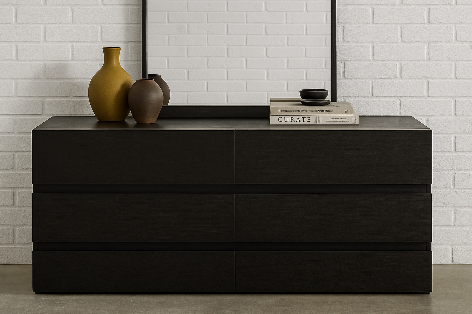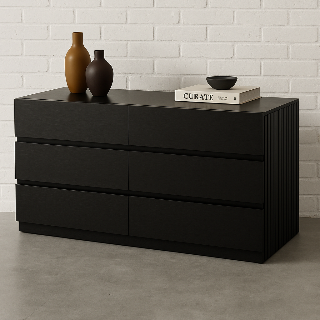 The SESTO Dresser (Black) — A bold statement of modern minimalism. The SESTO features a sleek, legless design that sits flush to the ground, creating a clean, contemporary silhouette. Finished in a rich wood matte black, this dresser offers ample storage with smooth, handle-free drawers that enhance its seamless look. Sophisticated yet practical, the SESTO brings a touch of refined elegance to any bedroom — luxury made simple, with a timeless modern edge.